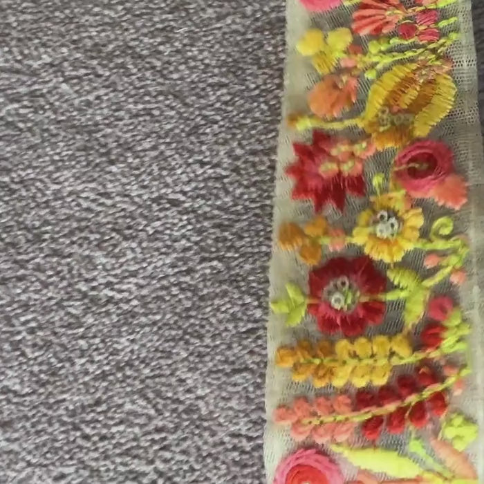 Add a touch of elegance to your projects with this "Floral net embroidered trim". Perfect for saree borders, crafts, and DIY creations, this delicate net lace features intricate floral embroidery for a sophisticated look.